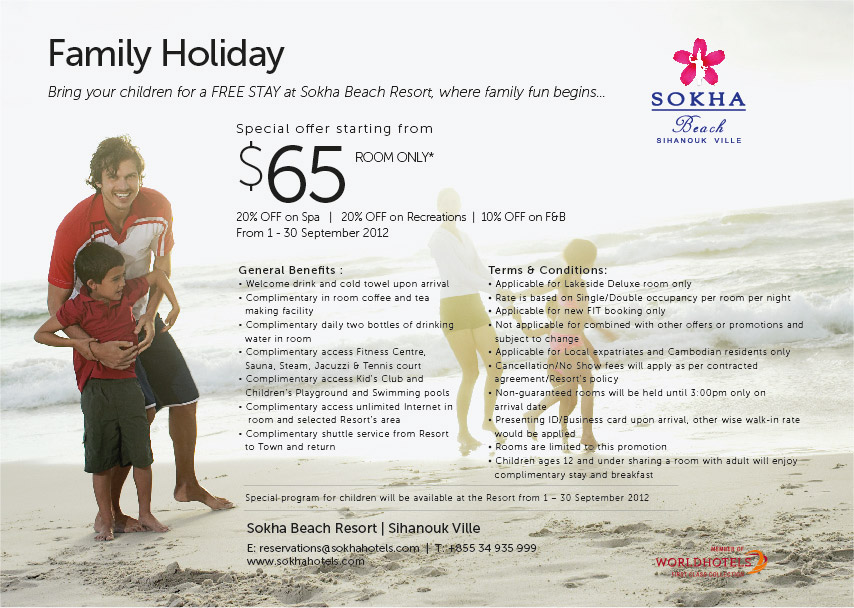 Two weeks left to take advantage of "Family Holiday" promotion. Bring your children for a FREE STAY at Sokha Beach Resort, where family fun begins…! If this e-mail is not displayed correctly, please click here for the online