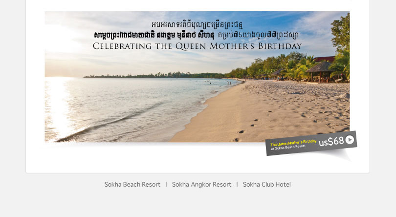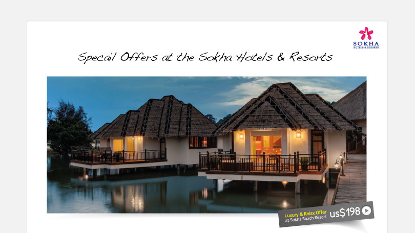 You are subscribed to this Sokha Hotels & Resorts Newsletter To unsubscribe from all of our mailings please send an email to: unsubscribe@sokhahotels.com with your email address in the subject line. To ensure delivery of this newsletter to your inbox and to enable images, please add newsletter@sokhahotels.com to your e-mail address book or safe senders list. | |||||||||||||||